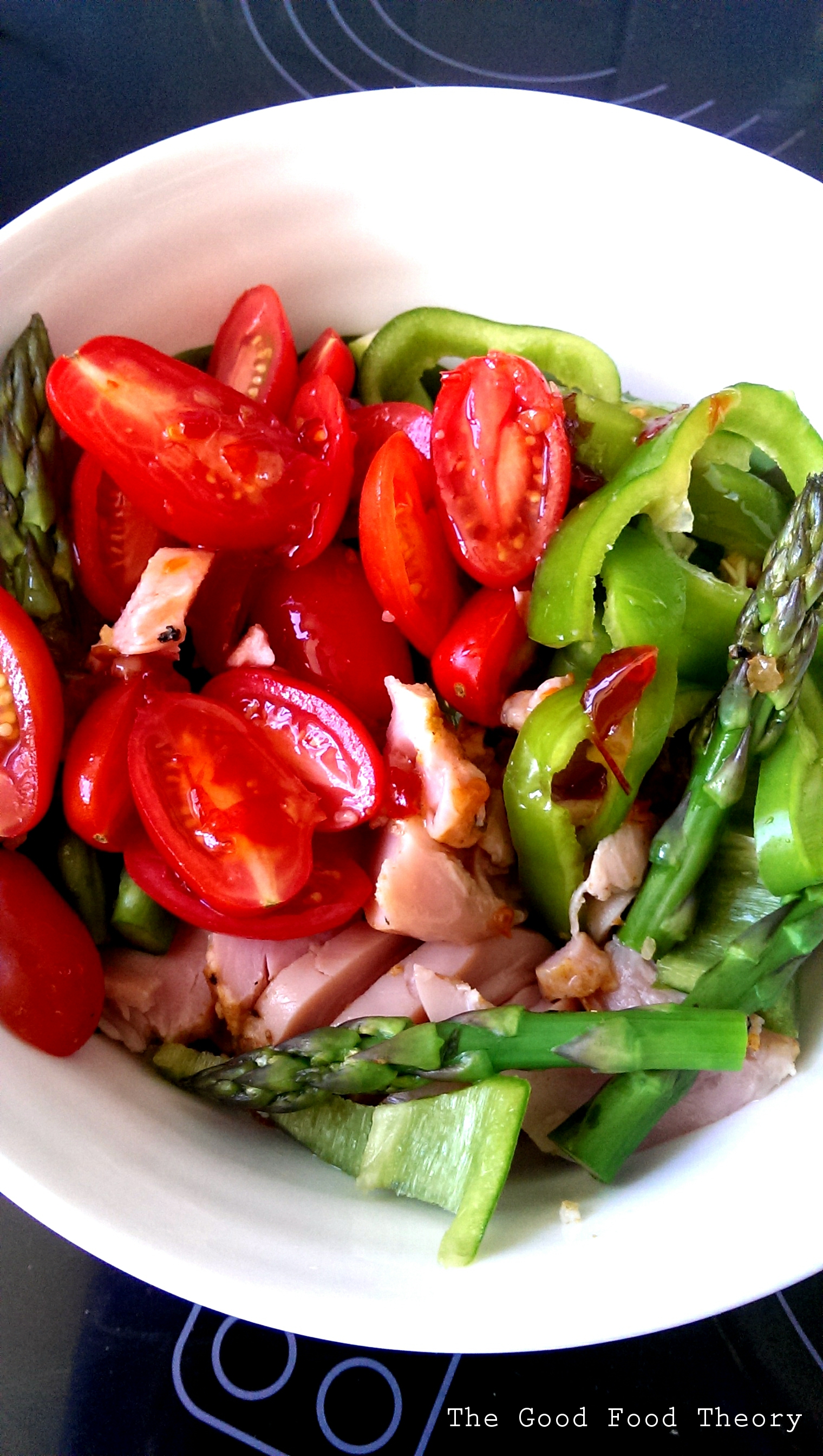 1) Grape tomatoes, green capsicum, steamed asparagus and smoked chicken* with a dressing of sweet chilli sauce, olive oil and lemon juice.  The vibrancy of the contrasting red and green is just beautiful (and delicious).